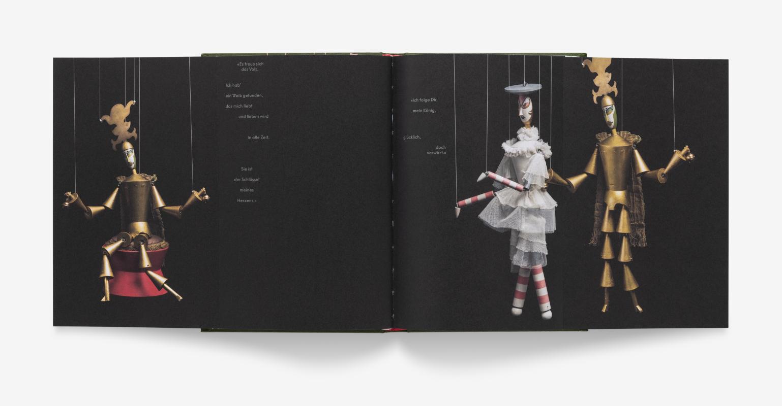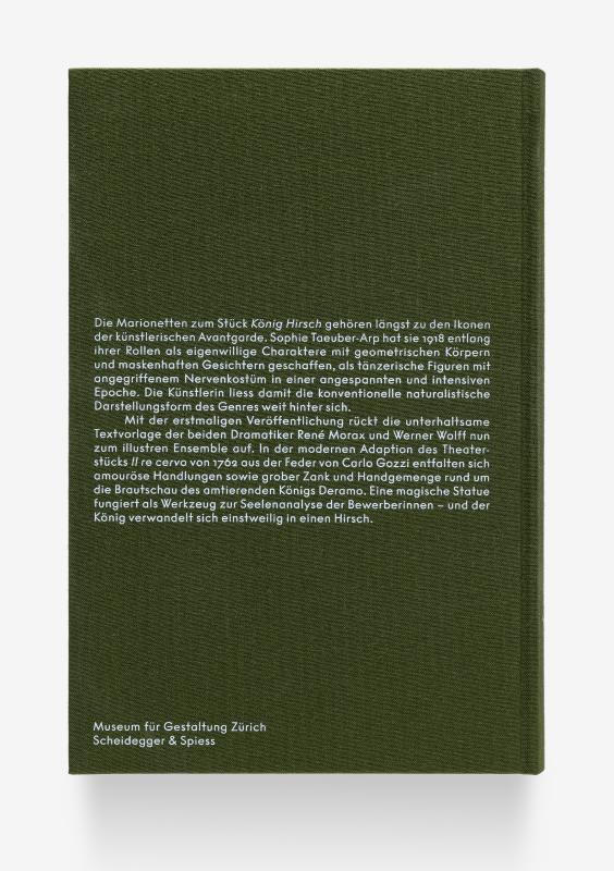 Die Marionetten zum Stück König Hirsch gehören längst zu den Ikonen der künstlerischen Avantgarde. Sophie Taeuber-Arp hat sie 1918 entlang ihrer Rollen als eigenwillige Charaktere mit geometrischen Körpern und maskenhaften Gesichtern geschaffen, als tänzerische Figuren mit angegriffenem Nervenkostüm in einer angespannten und intensiven Epoche. Die Künstlerin liess damit die konventionelle naturalistische Darstellungsform des Genres weit hinter sich. Mit der erstmaligen Veröffentlichung rückt die unterhaltsame Textvorlage der beiden Dramatiker René Morax und Werner Wolff nun zum illustren Ensemble auf. In der modernen Adaption des Theaterstücks Il re cervo von 1762 aus der Feder von Carlo Gozzi entfalten sich amouröse Handlungen sowie grober Zank und Handgemenge rund um die Brautschau des amtierenden Königs Deramo. Eine magische Statue fungiert als Werkzeug zur Seelenanalyse der Bewerberinnen – und der König verwandelt sich einstweilig in einen Hirsch.