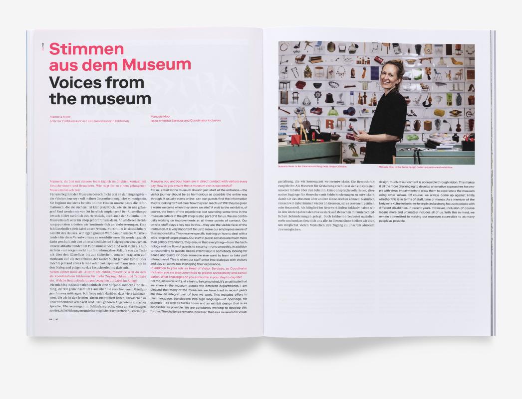 Für diese Ausgabe wurde das visuelle Erscheinungsbild des Magazins mit unserem Corporate Design verwoben – selbst das traditionsreiche DU-Logo erscheint für einmal in leuchtendem Pink, jener Farbe, die das Museum durch sein Jubiläumsjahr begleitet. So wird das Heft selbst zu einem kleinen Designstück zum Aufbewahren.