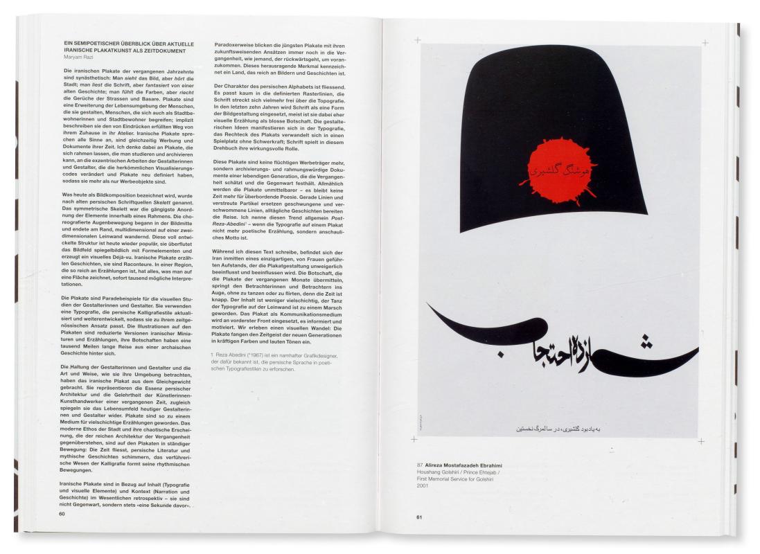Der Band Contemporary Iran versammelt iranische Kulturplakate von 1960 bis heute. Trotz vielseitiger gestalterischer Zugriffe belegen sie stets die Suche nach einer Verschmelzung von Historie und Zeitgenossenschaft, eigener Tradition und westlicher Inspiration, Kunst und Alltagskultur. Eine oft unorthodoxe Interpretation des persischen Kulturerbes verbindet sich mit dem souveränen Einsatz computergenierter Grafik. So bestätigen manche Plakate gängige westliche Vorstellungen islamischer Ästhetik, während andere diese radikal unterlaufen und unseren Blick irritieren und überraschen.