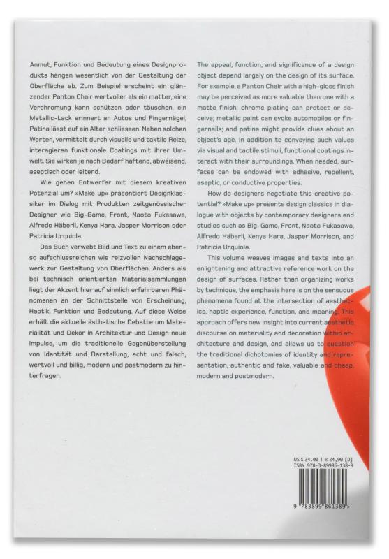 Anmut, Funktion und Bedeutung eines Designprodukts hängen wesentlich von der Gestaltung der Oberfläche ab. Je nach Textur erscheint zum Beispiel ein glänzender Panton Chair wertvoller als ein matter, eine Verchromung kann schützen oder täuschen, ein Metallic-Lack erinnert an Autos und Fingernägel, Patina lässt auf ein Alter schliessen. Neben solchen Werten, vermittelt durch visuelle und taktile Reize, interagieren funktionale Coatings mit ihrer Umwelt. Sie wirken je nach Bedarf haftend, abweisend, aseptisch oder leitend. Wie gehen Entwerfer mit diesem kreativen Potenzial um? Make up präsentiert Designklassiker im Dialog mit Produkten zeitgenössischer Designer wie Big-Game, Front, Naoto Fukasawa, Alfredo Häberli, Kenya Hara, Jasper Morrison oder Patricia Urquiola.