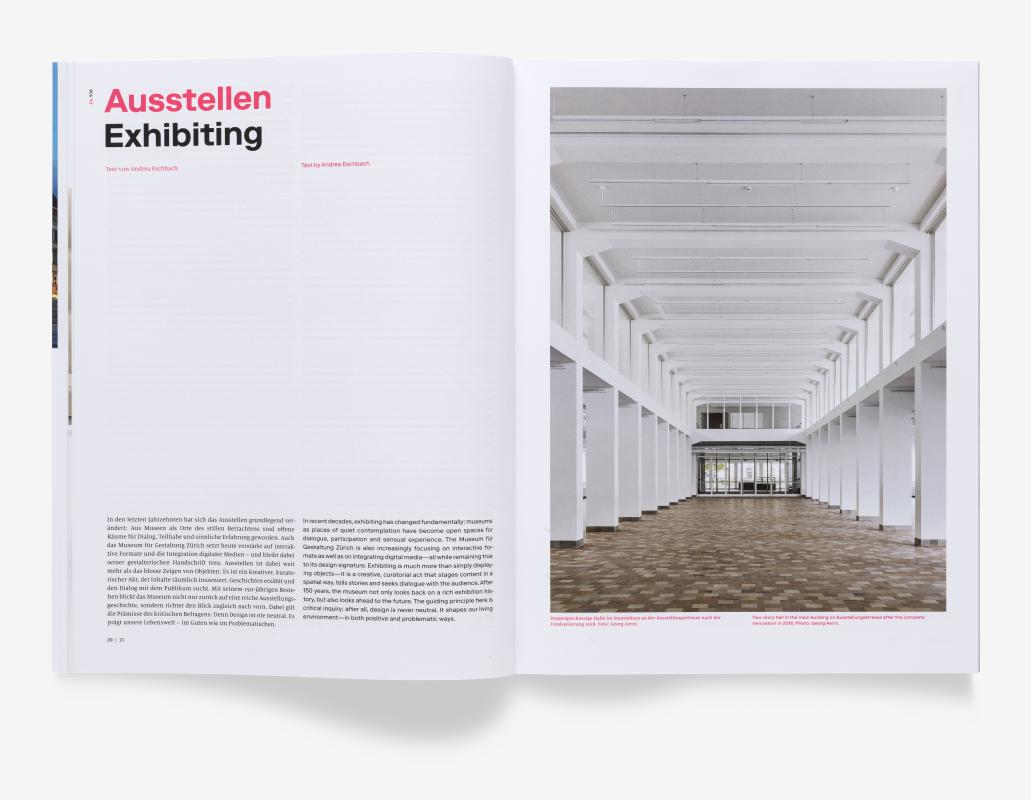 Für diese Ausgabe wurde das visuelle Erscheinungsbild des Magazins mit unserem Corporate Design verwoben – selbst das traditionsreiche DU-Logo erscheint für einmal in leuchtendem Pink, jener Farbe, die das Museum durch sein Jubiläumsjahr begleitet. So wird das Heft selbst zu einem kleinen Designstück zum Aufbewahren.
