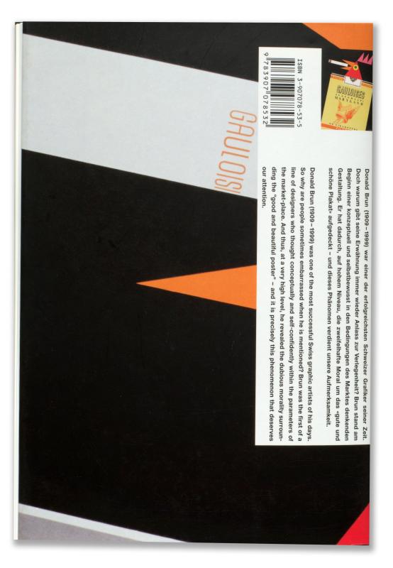 Donald Brun (1909–1999) war einer der erfolgreichsten Schweizer Grafiker seiner Zeit. Doch warum gibt seine Erwähnung noch immer Anlass zur Verlegenheit? Brun stand am Beginn einer konzeptuell und selbstbewusst in den Bedingungen des Marktes denkenden Gestaltung. Er hat dadurch, auf hohem Niveau, die zweifelhafte Moral um das «gute und schöne Plakat» aufgedeckt – und genau dieses Phänomen verdient unsere Aufmerksamkeit. Donald Brun war 1951 Mitbegründer der Alliance Graphique Internationale AGI.