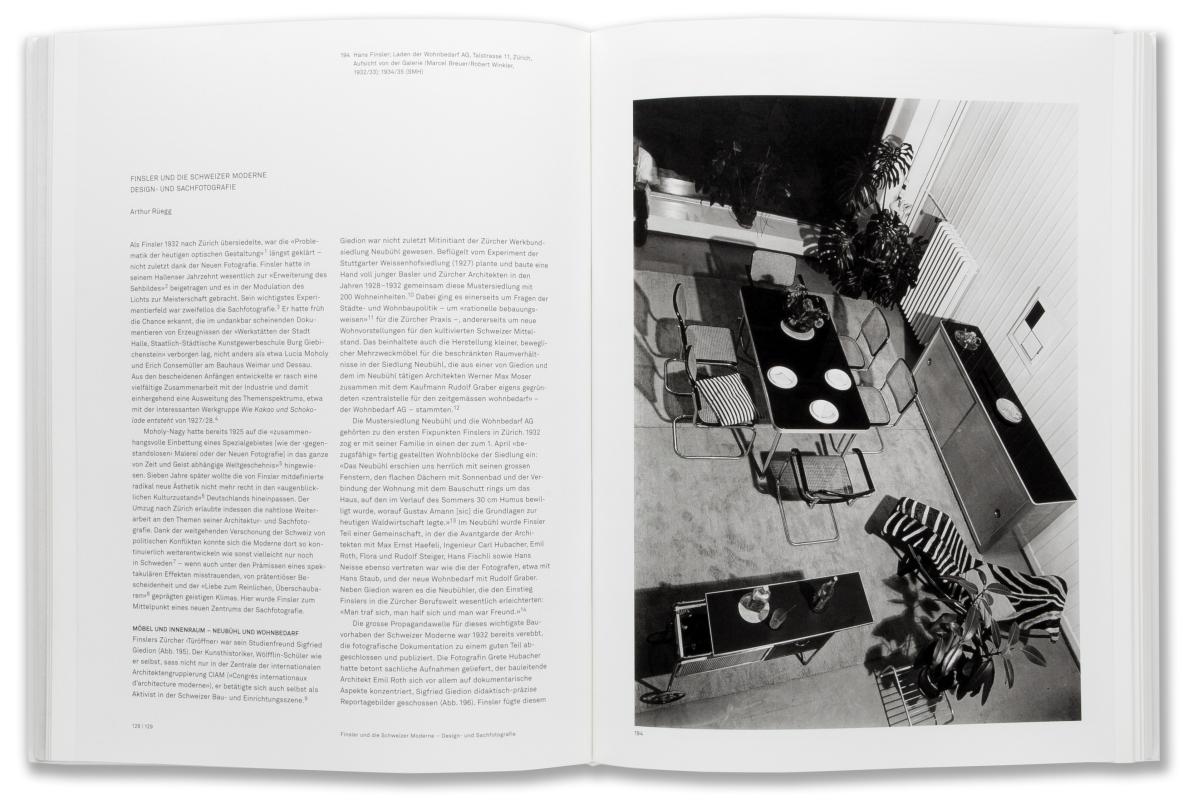 Durch Finslers frühe Emigration 1932 und sein Wirken in Zürich konnte der Impuls einer mediengerechten modernen Fotografie in der Schweiz kontinuierlich weitergeführt werden und nach 1945 auf die Nachbarländer zurückwirken. Die Publikation untersucht Finslers Tätigkeit für den SWB und seine Zusammenarbeit mit bedeutenden Architekten, Gestaltern und Schweizer Firmen (Wohnbedarf, Porzellanfabrik Langenthal, Möbelfabrik Embru, Textilfabrik Heberlein). Als Leiter der legendären ersten Schweizer Fotoklasse übte Finsler gemeinsam mit Alfred Willimann, dem Lehrer für Schrift und Fotomontage, hier grossen Einfluss aus. Den hohen Stellenwert dieser Lehre belegen nicht zuletzt die in dieser Publikation versammelten eigenständigen Arbeiten von Schülern und Schülerinnen wie Werner Bischof, René Burri, Serge Libiszewski, Anita Niesz, Ernst Scheidegger, Emil Schulthess und Michael Wolgensinger. Sie verweisen auch auf die zunehmenden Kontraste zwischen Finslers fotografischer Auffassung und dem aufkommenden Bildjournalismus.