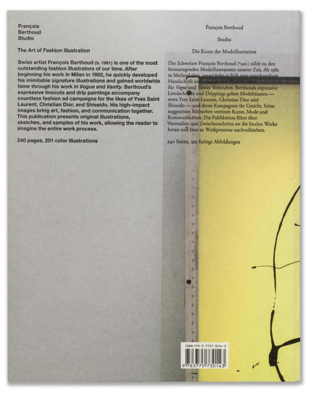 Der Schweizer François Berthoud (*1961) zählt zu den herausragenden Modeillustratoren unserer Zeit. Ab 1982 in Mailand tätig, entwickelte er früh eine unverkennbare Handschrift in der Illustration von Kleidern, Schuhen, Taschen, Parfums und Accessoires. Mit Arbeiten für Magazine wie Vanity oder Vogue erlangte er Weltruhm. Berthouds expressive Linolschnitte und Drippings geben Modehäusern – etwa Yves Saint Laurent, Christian Dior und Shiseido – und deren Kampagnen ihr Gesicht. Seine suggestiven Bildwelten vereinen Kunst, Mode und Kommunikation. Die Publikation führt über Vorstudien und Zwischenschritte an die finalen Werke heran und lässt so Werkprozesse nachvollziehen.