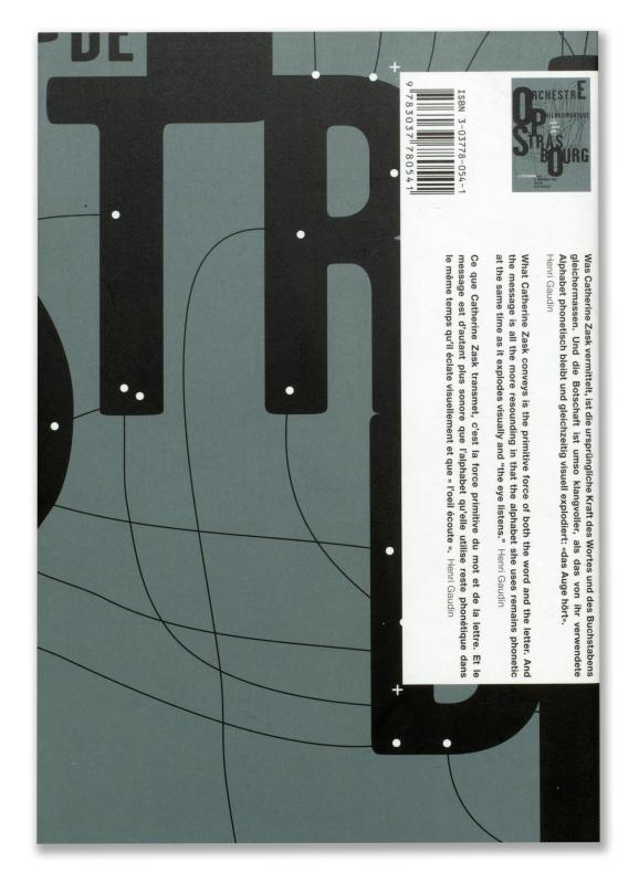 Catherine Zask wird zu den bedeutendsten Grafikerinnen Frankreichs gezählt. Ihre typografischen Kulturplakate zeichnen sich durch einen ungewöhnlichen Umgang mit der Schrift aus. Besonders für Augen, die am Erbe der Schweizer Grafik geschult sind, wirkt ihre Formensprache anregend und fremd. Die 1961 in Paris geborene Zask verschafft dem Buchstaben eine Autorität, die gewöhnlich nur dem Bild zugestanden wird. Er kann Bewegungen oder Echos auslösen, auf die Zwischenräume wirken, Bilder speichern – aber immer im Bestreben, einer Aussage eine angemessene und verständliche Form zu geben. Ihre Plakate für die Société civile des auteurs multimedia (Scam) und für das Theater L’Hippodrome in Douai belegen die Kohärenz und Eleganz ihres Schaffens. Damit ist für Zask der Dialog mit dem Kunden und dem Publikum von zentraler Bedeutung. Ihr Werk wird erstmals in einer Monografie gewürdigt.